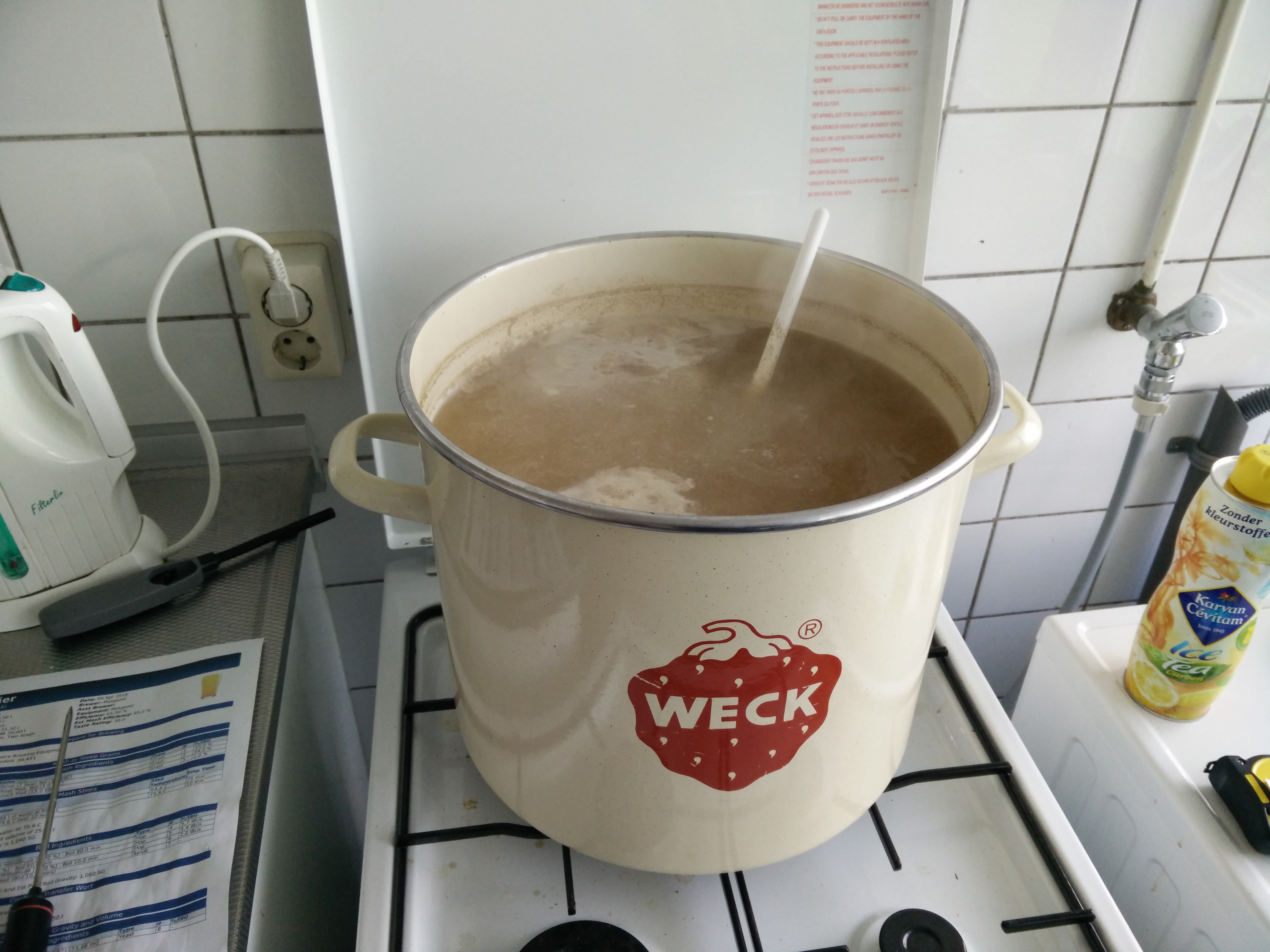 Walter’s White, inderdaad, geïnspireerd door meester-brouwer Walter White. Ons eerste witbier, in afwachting van een mooie zomer. Het is een witbier van het Belgische type, en om het af te maken hebben we een royaal snufje koriander toegevoegd. Een primeur is dat we eindelijk ook het streefvolume van 20 liter hebben gehaald, in plaats van er tot wel 5 liter onder te zitten. (door gewoon meer water toe te voegen, het leven is soms zo simpel).